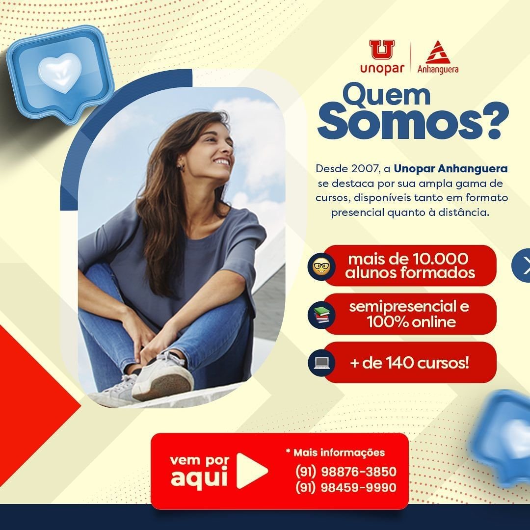 A Unopar Anhanguera é referência em inovação e reconhecida pela vanguarda acadêmica em seus cursos de graduação, extensão e pós-graduação lato e stricto sensu, com cursos nas modalidades semipresencial e online.